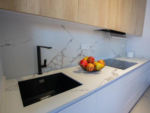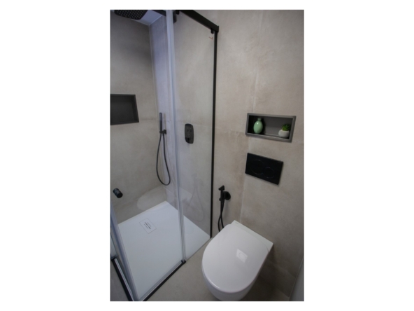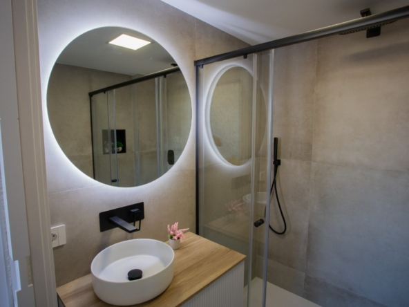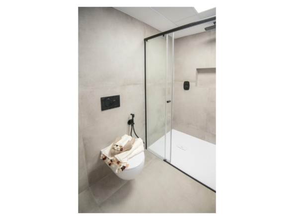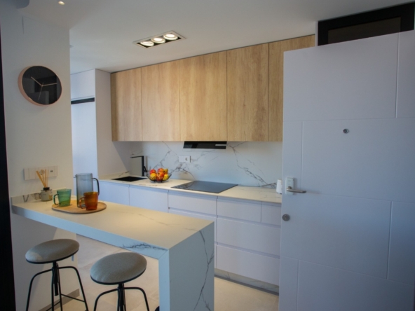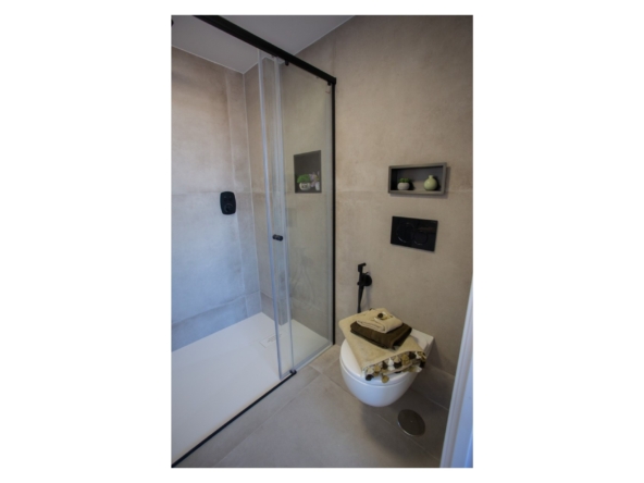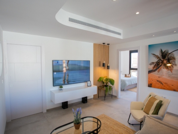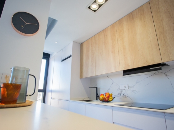 NEW-BUILD FLATS IN SAN PEDRO DEL PINATAR. Newly built residential complex with modern flats and penthouses in San Pedro Del Pinatar. Flats and penthouses with 2 or 3 bedrooms, 2 bathrooms, with open fully equipped kitchen with white goods – Bosch or Siemens, living room, large terraces, fitted wardrobes, fully equipped bathrooms with underfloor heating, aircon, electric shutters, enclosed storage room, parking space with socket 16 Amp for electric cars. Beautiful communal garden with artificial grass and Infinity pool with heat pump.