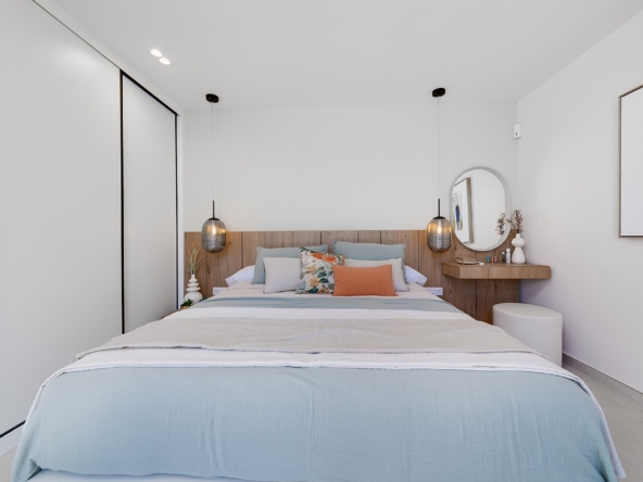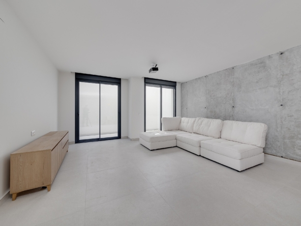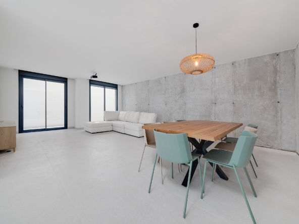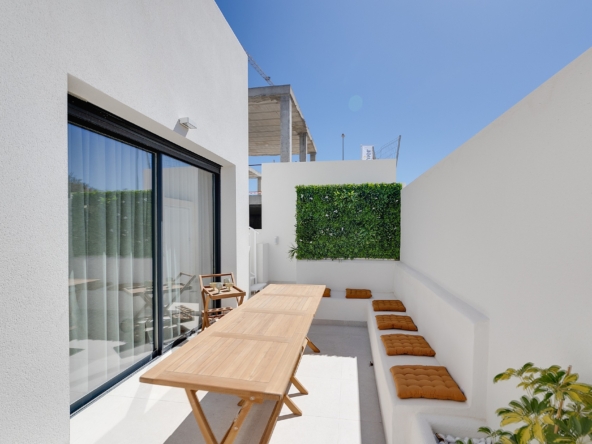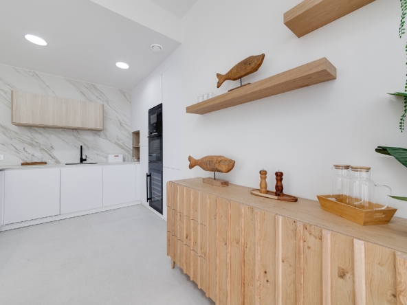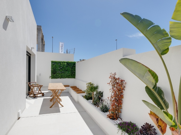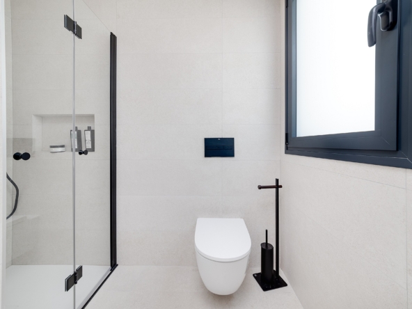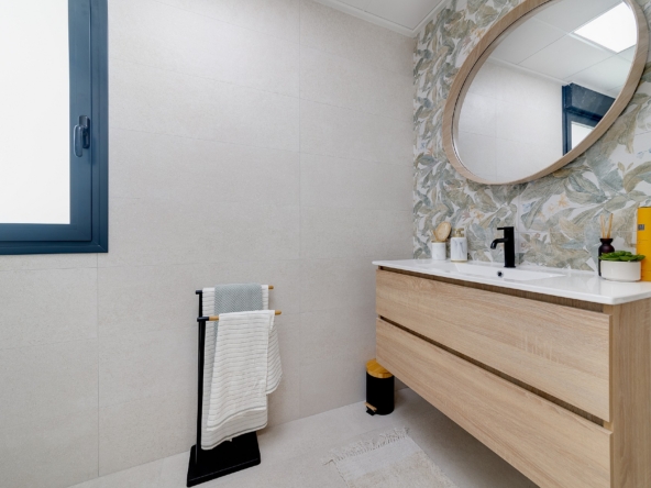 The fully finished garden with tiles, artificial grass and plants, together with a private swimming pool and outdoor shower, provides the perfect outdoor space to relax and enjoy the Mediterranean climate. With an electric gate and parking space for your car, comfort and safety are guaranteed.