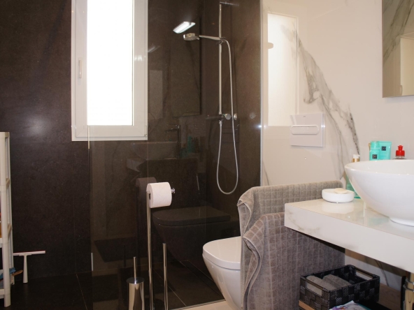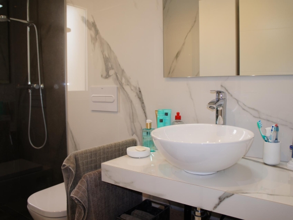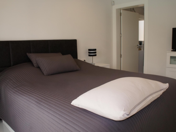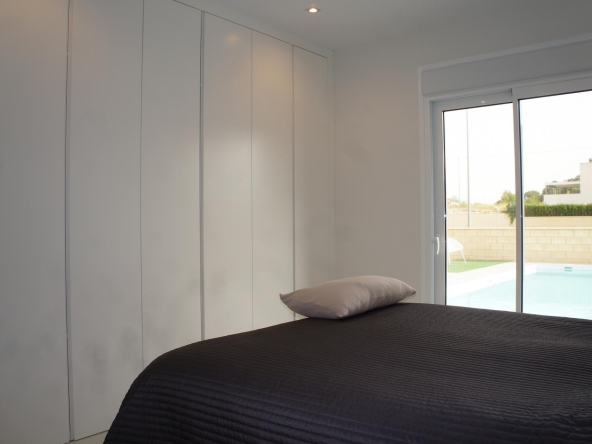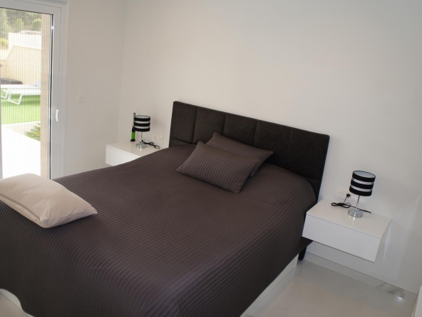 In total there are 3 double bedrooms with the master bedroom suite. The master bedroom has a window overlooking the pool and an en-suite bathroom with sinks.