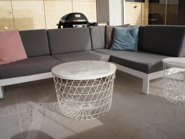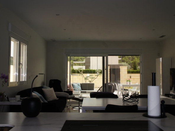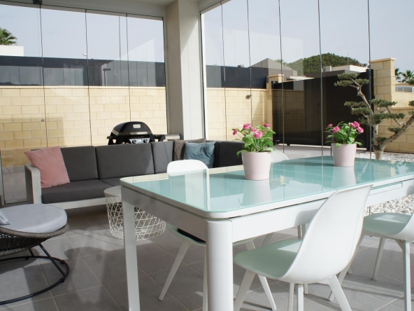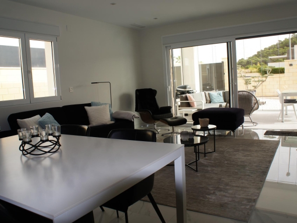 The villa itself is light and bright and furnished in a modern minimal fashion taking advantage of the light flooding in from the windows in the lounge and dining room as well as the patio doors leading to the shaded & glased in naya at the front of the property with views over the gardens, pool area and mountain sinery.